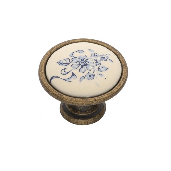 Ένα κλασικό vintage πόμολο επίπλου με πορσελάνη για έπιπλα μπάνιου, κουζίνας και σαλονιού, σε αντικέ - γαλάζιο χρώμα, που χαρακτηρίζεται για την ποιότητα και την κομψότητά του.