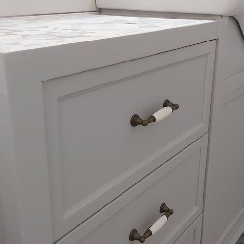 Μία κλασική vintage λαβή επίπλου με πορσελάνη για έπιπλα μπάνιου, κουζίνας και σαλονιού, σε αντικέ - κρακελέ χρώμα, που χαρακτηρίζεται για την ποιότητα και την κομψότητά της.