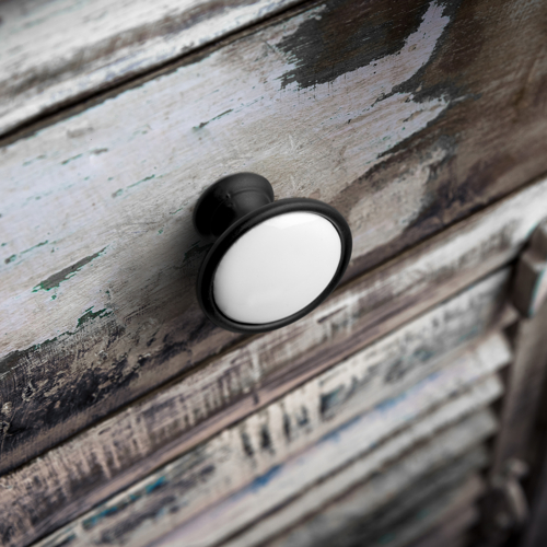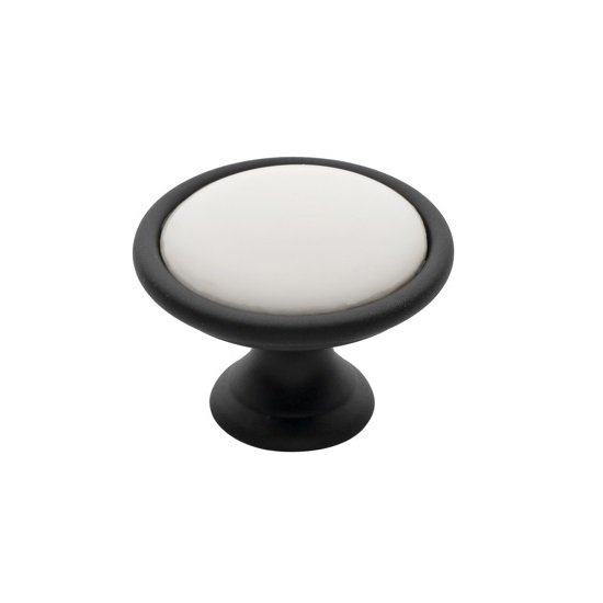 Ένα κλασικό vintage πόμολο επίπλου με πορσελάνη για έπιπλα μπάνιου, κουζίνας και σαλονιού, σε μαύρο ματ - λευκό χρώμα, που χαρακτηρίζεται για την ποιότητα και την κομψότητά του.