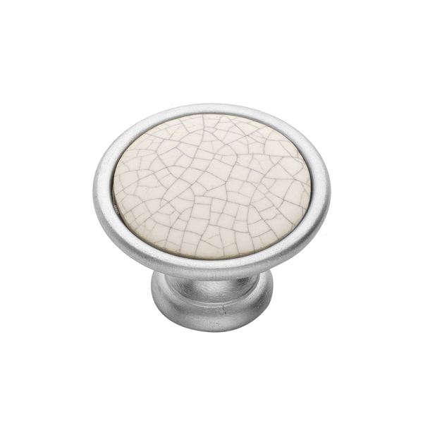 Ένα κλασικό vintage πόμολο επίπλου με πορσελάνη για έπιπλα μπάνιου, κουζίνας και σαλονιού, σε νίκελ σατινέ κρακελέ χρώμα, που χαρακτηρίζεται για την ποιότητα και την κομψότητά του.