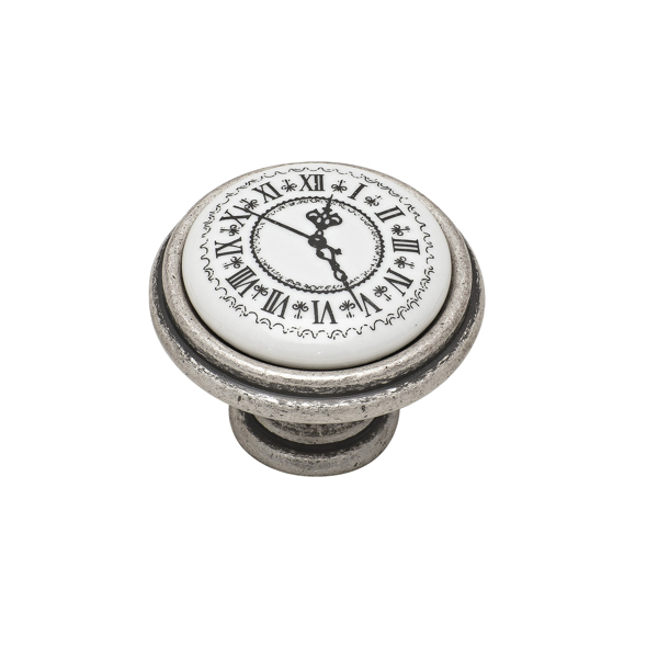 Ένα κλασικό vintage πόμολο επίπλου με πορσελάνη για έπιπλα μπάνιου, κουζίνας και σαλονιού, σε old silver - ρολόι χρώμα, που χαρακτηρίζεται για την ποιότητα και την κομψότητά του.