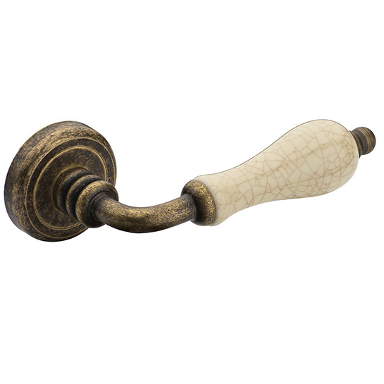 Classic and traditional antique brass door handle. Made of top quality brass and Italian porcelain. The product is supplied to the customer in the manufacturer's box. Each pack contains 1 pair with the appropriate accessories and their rosettes. Suitable for all weather conditions.