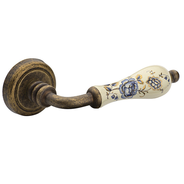 Classic and traditional antique brass door handle. Made of top quality brass and Italian porcelain with blue flower pattern. The product is supplied to the customer in the manufacturer's box. Each pack contains 1 pair with the appropriate accessories and their rosettes. Suitable for all weather conditions.